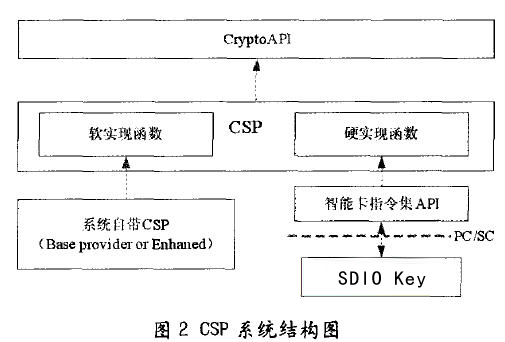 從圖1可以看出,它分為應用層:系統(tǒng)層和加密服務提供層。處于應用層的應用程序通過Crypto API來調用CSP模塊提供的各種服務。